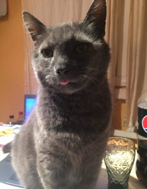 Han er en stor grå katt som er veldig kosete. Han glemmer ofte tungen ute etter å ha mjauet. 14 år gammel.