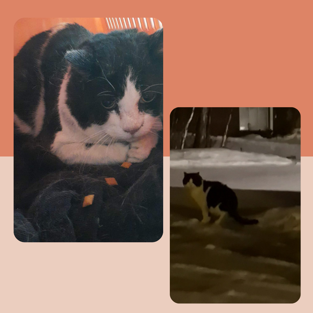 Svart og hvit, tam, men redd og på vakt" og forsiktig også ute. Kunde som så han fikk klappet han og han kom bort for kos da hun bøyde seg ned..