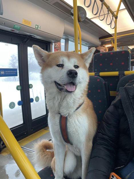 Japansk Akita inu. Stor hund, krøllete hale, 35kg. Han hadde på rosa refleks rundt halsen og bånd.