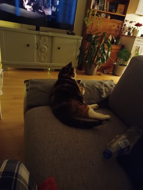 Tricolor med svart, brun og hvit, korthåret, 10 år gammel hunnkatt. Hvit maske i ansiktet og hvite poter. 🥺🙀
