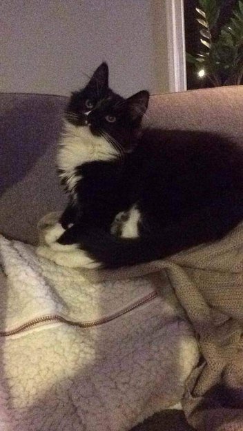 Mest svart, med noe hvitt på poter og noe hvitt i ansiktet, mest under haken. Han hadde på en refleks sele når han forsvant