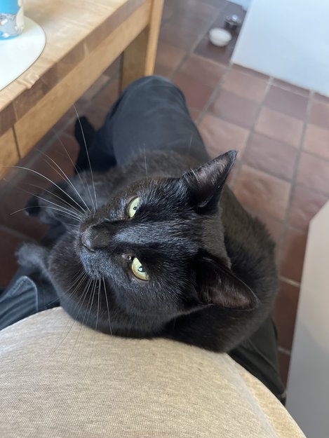 Sort med noen hvit flekker på hals og pote, gule øyne. Veldig kosete og kan virke oppsøkende.