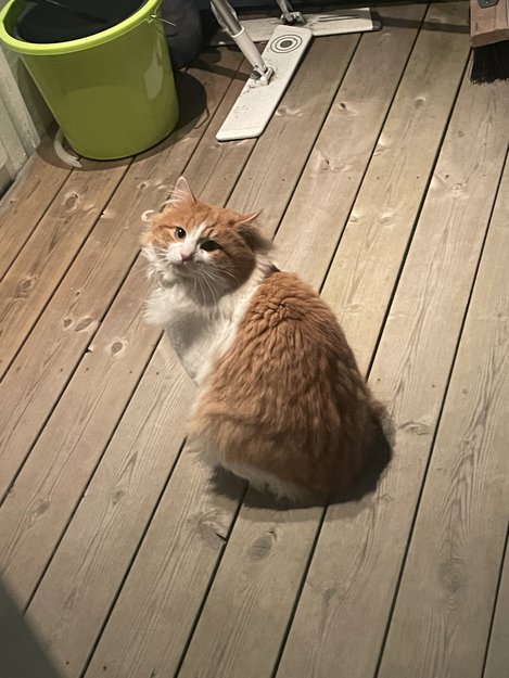 Katten er rød og hvit, veldig lodden og den er fin i pelsen. Den er veldig stor med veldig mye pels👍🏼