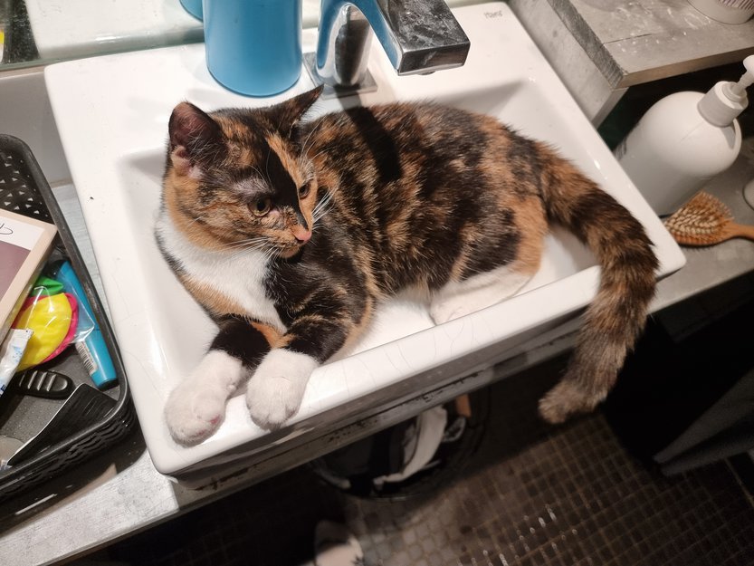 Vår innekatt Loulou har klart å snike seg ut inngangsdøren. Hun er en tricolor katt med markans strek over ansiktet. Hun har aldri vært ute før, og må tas inn i varmen om noen finner hemne