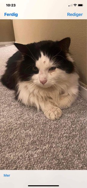 Tatt med til dyrlegen av finner, for å lese chip etter å ha stått utenfor et døgn å jamret seg. Ifølge dyrlegen bærer katten preg av å ha gått ute en god stund da den virker å ha luftveisinfeksjon. Floker i pelsen og på halen. Eier er etterlyst på FB. Katten er ikke IDchippet eller kastrert. Er derfor levert inn til Dyrebeskytteslen Oslo og Akershus da ikke eier ble funnet.