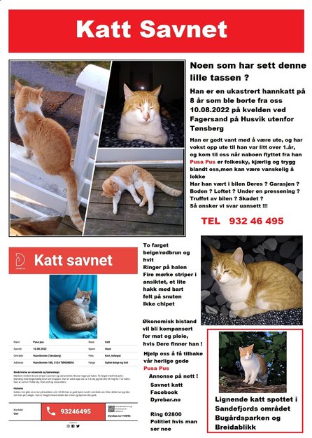 Pus forsvant for over 5 mnd siden, men kan ha kommet seg i en bil