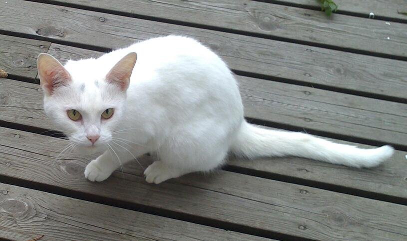 Pus er ei ung lita og slank kattefrøken, helt hvit med 2 små svakt grå flekker over øynene. Hun er veldig kjælen og er tydelig vant til mennesker.