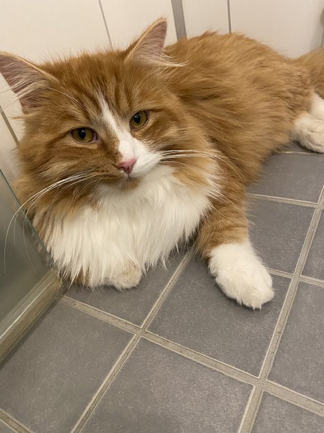 Han er en langhåret katt med oransje og hvit pels. Han er ett og et halvt år.