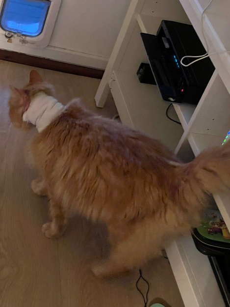 Har vært i slosskamp og fått seg noen stygge sår på halsen. Har derfor stor bandasje på halsen.