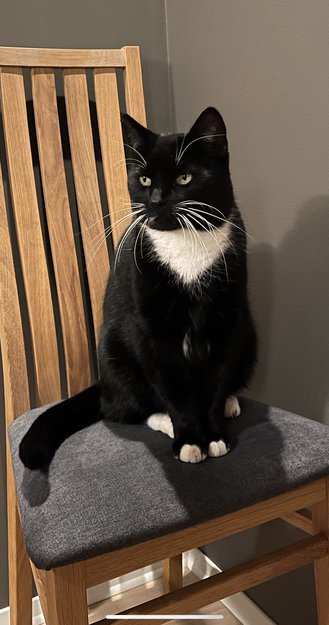 Stor sort katt med hvite markeringer på poter og hals. F. 2015. Mangler en hjørnetann.