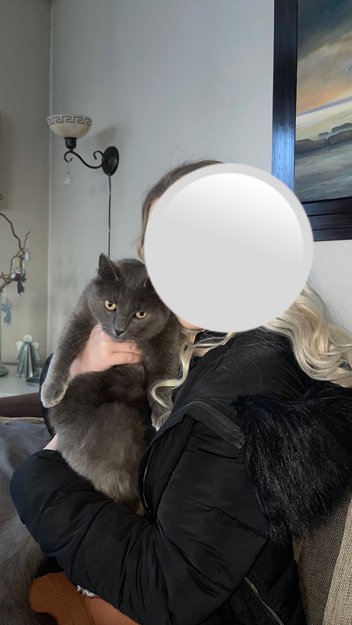 Gul/grønne øyne. Litt stor han katt. Myk pels. Veldig kjærlig og kosete. Reagerer på navnet pus/gråpus