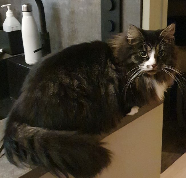 Brun prikk mellom nesen og munnen i det hvite området. Hvit over nesen.