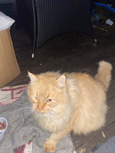 Har gått i området her ca 2 år. Har matet den over litt tid , nå kommer den til meg, gnir seg inntil og maler når jeg klapper den. Den er fortsatt på vakt og føler den seg sperret biter den skikkelig men blir stadig bedre. Han har store tover på begge sider og på halsen så den trenger og barberes. Tar den til veterinær når det blir mulig. Den er veldig stor katt. Håper eier ser dette så han kan komme hjem