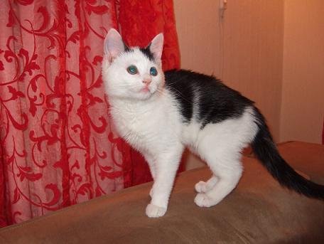 Se bildet. Hun har også et svart og hvis halsbånd med bjelle.