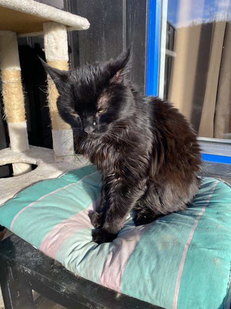 Den har noen få hvite pels hår på brystet ellers er den svart litt lodden pels. Er rundt 1 år gammel.