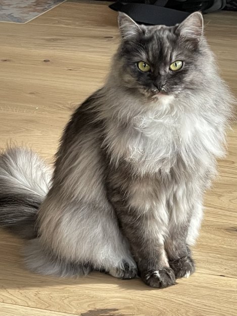 Grå pels med hvitt underpels, grønne øyene. Fargen heter Smoke.