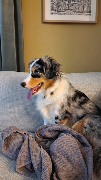 Veldig ydmykt blikk på ho .. kan være folkesky . Har på seg et lilla halsbånd