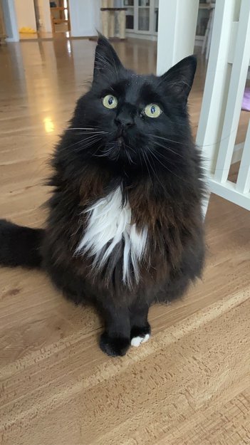 Svart med hvitt bryst. Venstre frampote er hvit nederst. Hvit under armhule. Operert bort hoftekuler bak så kan ikke hoppe som før. Stor katt med mye pels.