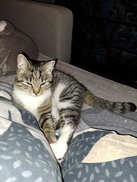 En veldig kjælen og tillitsfull pus. Gråstripet med hvitt bryst og poter.