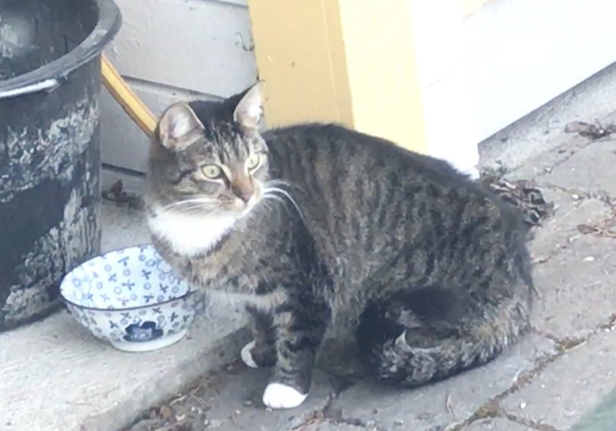 Katten er veldig sulten og svært sky. Vi lurer på om den hører dårlig. Hvit på brystet, under haken og i hvertfall på tre av labbene.