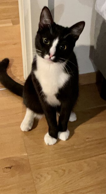 Sort, med hvite markeringer på potene, og bryst. samt en hvit på snute og mellom øynene. Rosa nese. Øynenne er gule og grønne. Kastrert hannkatt på snart 2 år.
