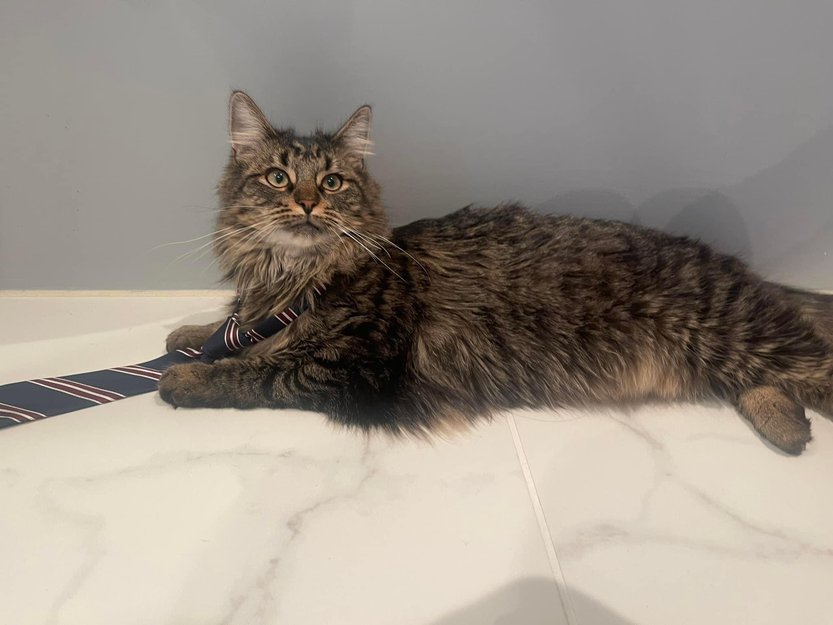 Ludde er en semilanghåret spraglete katt med fine tegninger og en sort stripe over ryggen. Halen er stor og flott med lang pels.