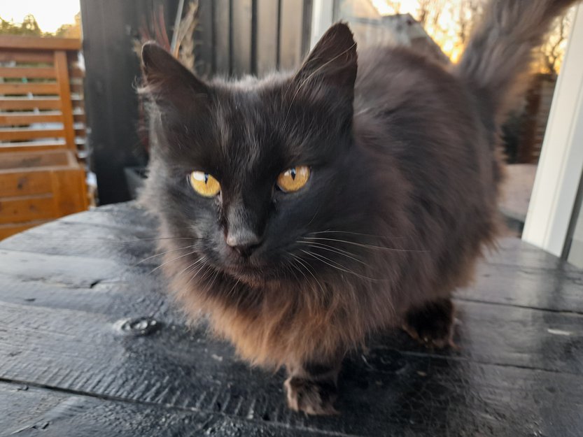 Svart langhåret katt (klarer ikke å se kjønn i all pelsen) har vandret rundt her i flere mnd. Litt frem og tilbake mht antall ganger. Oppsøker oss mer og mer. Mye floker i pelsen så tror den ikke finner veien hjem. Men er tillitsfull så tror den tidligere har hatt et hjem.