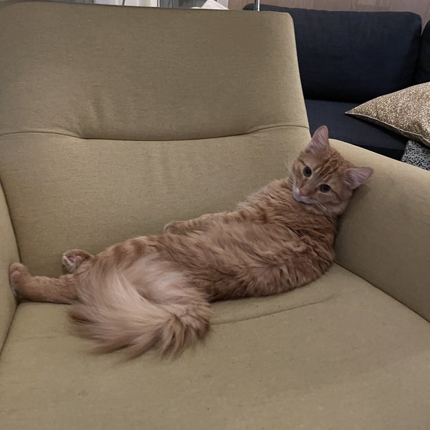 Ung hannkatt med mellomlang pels. Lang, fin og bustete hale.