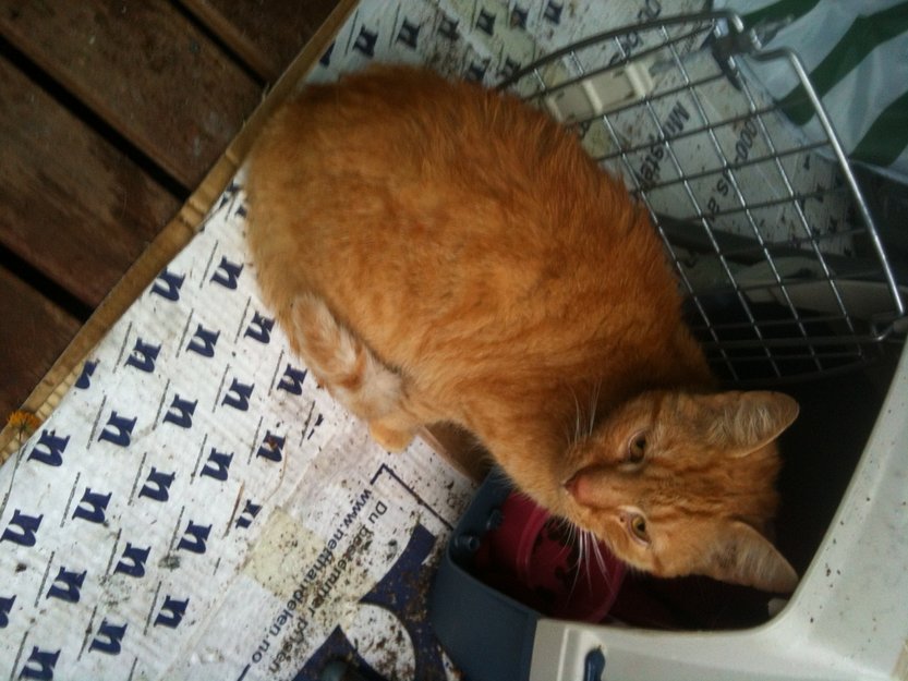 Dukket plutselig opp her for va 3 uker siden. Etter 2 uker har eg begynt å gi han mat å satt opp ett bur med teppe i sånn at han har ett trygt sted å sove.