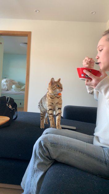 Hun ser litt ut som en liten Leopard/gepard med ringet hale nesten som en vaskebjørn. Hun snakker/mjauer mye. Kan være litt sjenert ovenfor fremmede, men når man kjenner henne hopper hun opp på skulderen din og er ikke redd for noe.