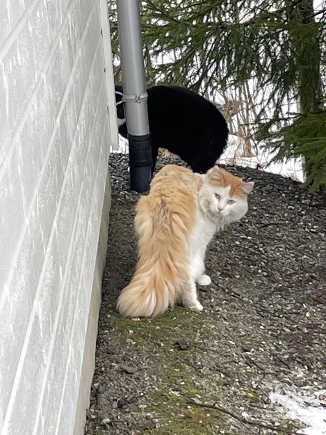 Gikk forbi denne katten på tur. Hannkatt, ukastrert, slåss og herjer i Mysen på Skofterudåsen/Momarken med kattene i nabolaget. Prøvd å komme seg inn en katteluke denne vinteren.. Kommer ikke nær den, og får ikke kost med den eller lest chip. Ønsker å finne pus sitt hjem 🐈
