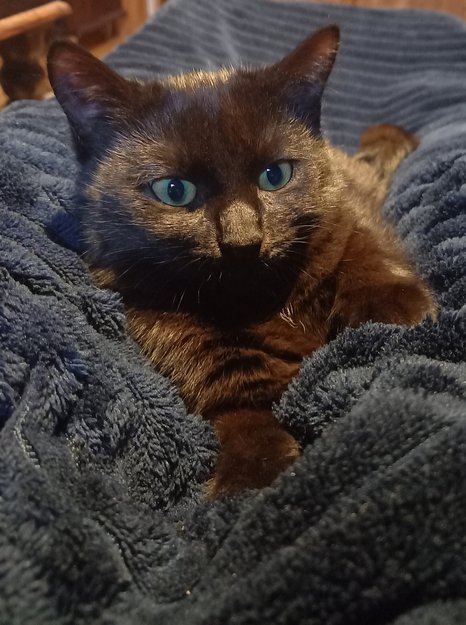 Mia er helt svart bortsett fra noen få hvite hårstrå i bringa. Øynene hennes er grønne.