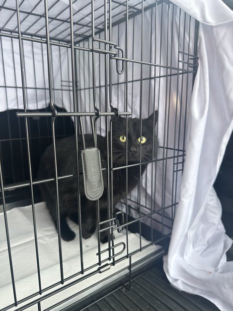 Svart, ukastrert hannkatt som har oppholdt seg og sett tidvis i en låve i flere måneder. Vi har brukt noe tid på å få den fanget. Oppleves delvis vill, sky og redd.