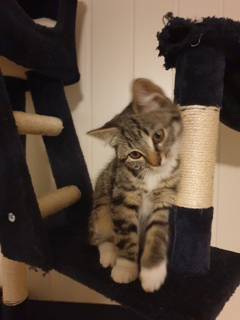 Tabbytrekk, scottish fold, kontaktsøkende, hjemmekjær, tillitsfull og pratsom frøken. Spraglete/stripete grå, svart med hvit. Hvit på poter og bringe. Brunlig i ansiktet.