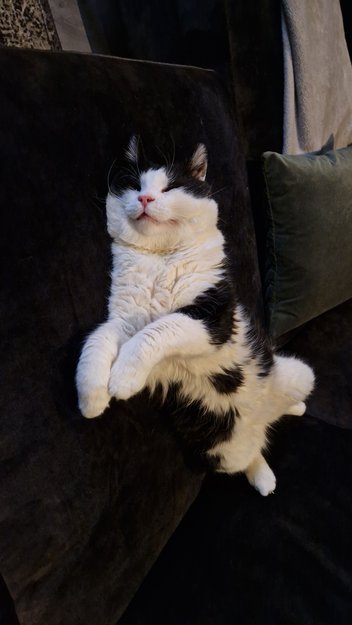 I følge veterinær so er han en kraft kar fra naturens side. Øverste del av katten er svart , under er han hvit med en svart ring på magen, halen er helt svart.