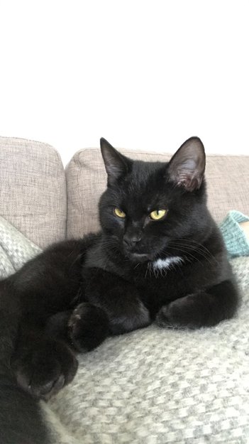 Svart med hvit flekk på brystet, han har en krøll på halen som ikke er lik andre og mangler litt hår der.