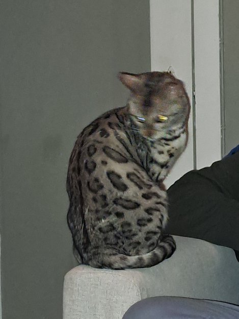 Ligner en jaguar. Det er en bengal katt. Grå farget pels med avlange eller runde svartr former