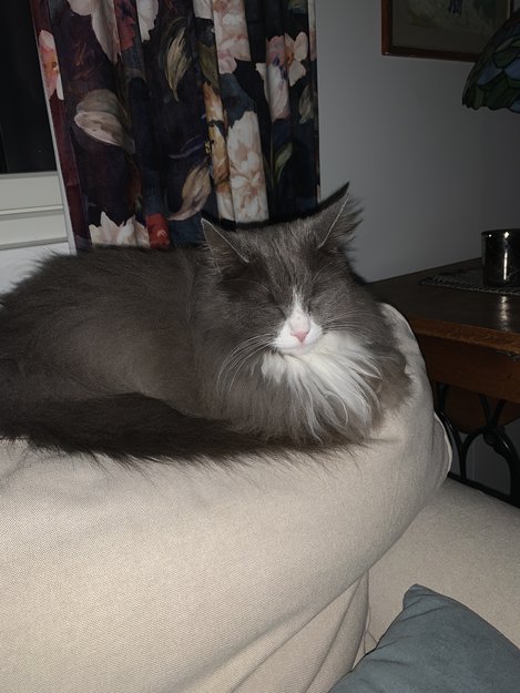 Grå og hvit,liten men med mye pels. Hvite labber.