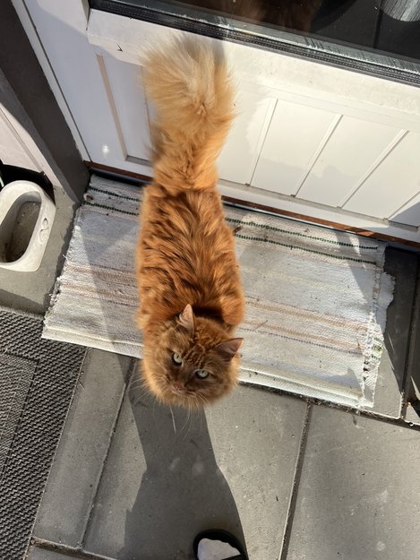 Orange katt funnet. Tror det er av typen skogskatt. Sorte små prikker på snuten. Den er veldig tynn og kontaktsøkende. Klumper i pelsen.