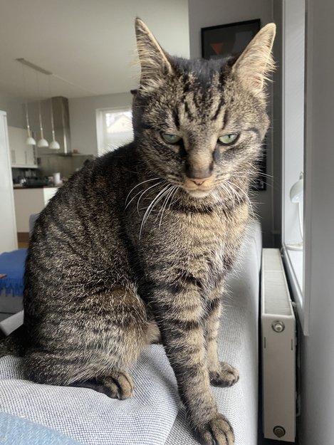 Slank og sprek hannkatt (ca 5 kg), nokså lange ben, tiger/makrell/mønstret grå, liten hvit flekk på brystet, rosa snute. Lyder navnet Messi eller Pus. Kosete og glad i mat.