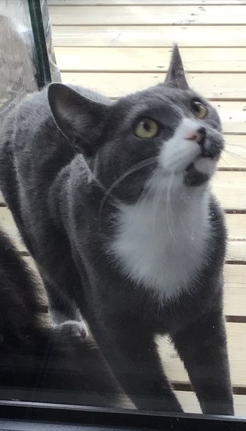 Katten hoppet over gjerde på balkongen. Han er en innekatt og er veldig sky.