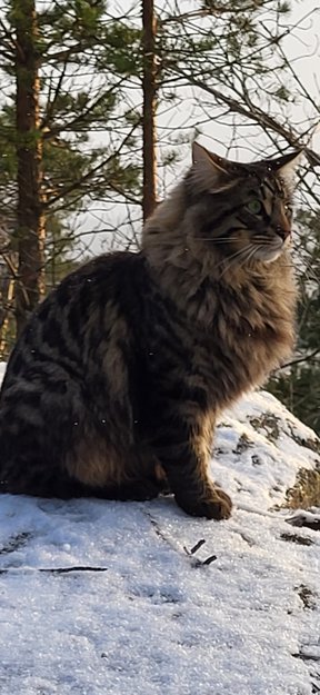 Vi er på påskeferie i Trysil, rett ved skisenteret. Katten har vært her flere perioder tidligere. Den har luke i veggen og styrer inne-utetid selv.