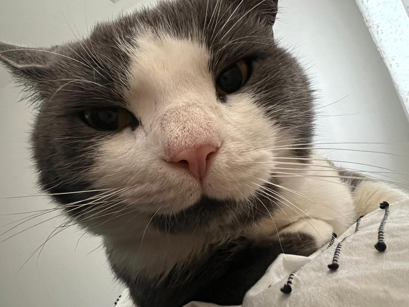 Peynir er 6år gammel hann katt med gråhvit pels. Hadde klore merker på nesa.