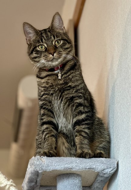 Han har tigerstriper og har på et gult halsbånd med refleks. På halsbåndet henger det et lite kammer med navn og telefonnummer i.