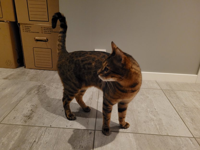 Bengalkatt. Leopardmønster i pelsen. Slank og lange bein. Veldig sosial og konatktsøkende.