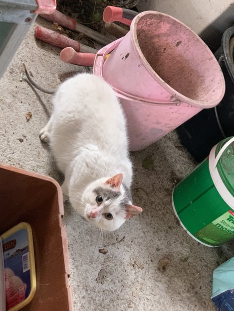Katten har oppholdt seg rundt og i en garasje. Der har den visst vært der siden jule tider, men jeg fant den selv i dag (9.april).