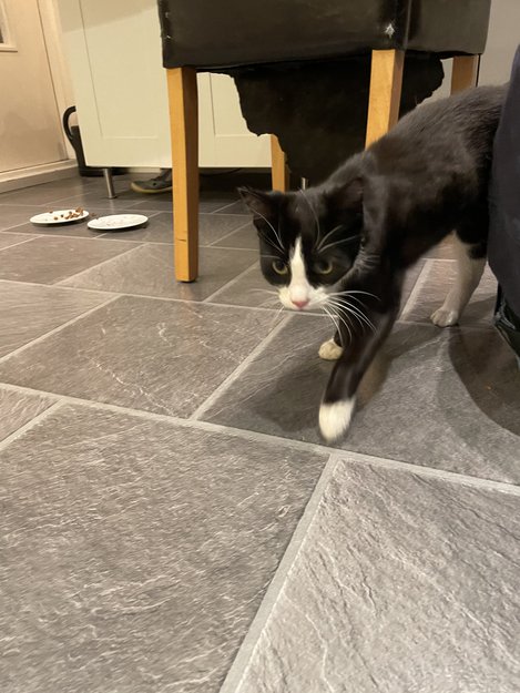 Svart, ung katt med hvite «sokker», hvit hals og nese. Veldig mager
