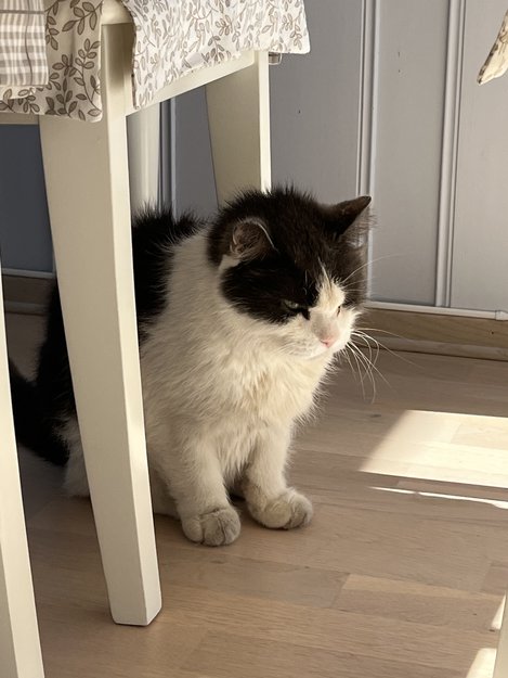 Marius, hvit og grå katt ble borte for oss etter at den var ute en tur på hytta. Han er ID-merket. Vi har lett og lett i områdene rundt; uvanlig lenge borte.