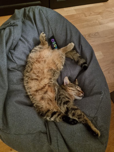 Tigerstripete brun/svart hannkatt. Veldig sosial og liker å vere der folk er. Nysgjerrig på det meste og kan fort snike seg inn i ei åpen bod eller liknande