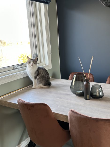 Innekatt som kom seg ut gjennom vindu på natten. Ikke vandt til å være ute. Så spor etter han på vinduskarmen.